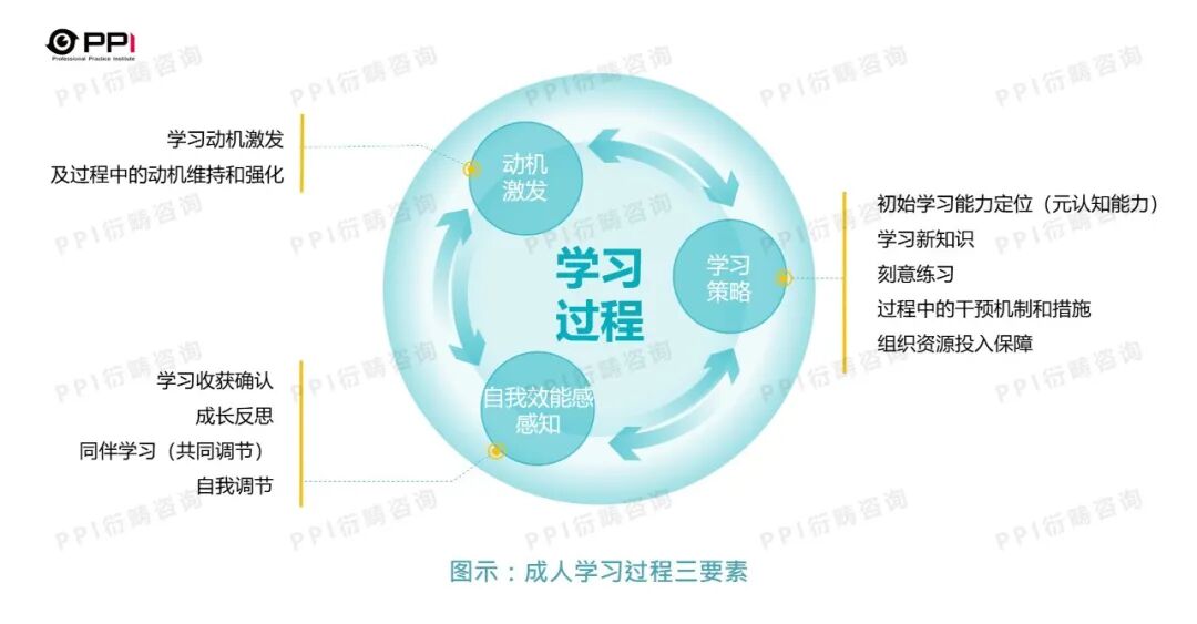 PPI认为企业中的成人学习全过程离不开三个方面,分别是围绕个体学习动机的“全过程”、学习策略设计的“全过程”,以及自我效能感感知的“全过程”。