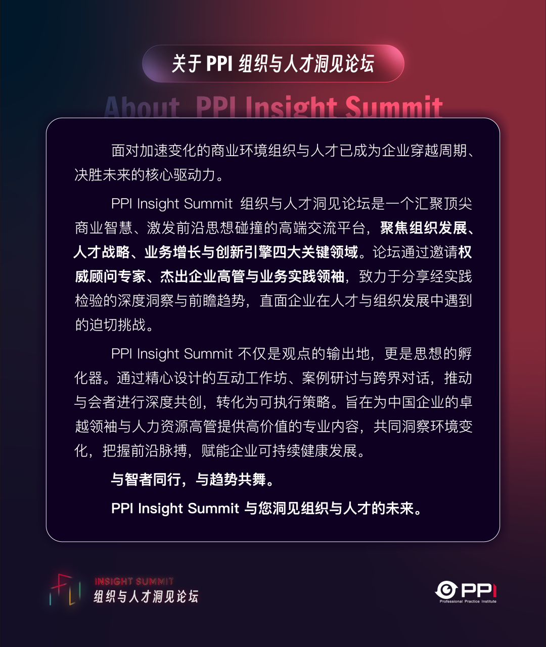 PPI组织与人才洞见论坛作为一个汇聚顶尖商业智慧的高端交流平台,始终聚焦组织发展、人才战略、业务增长与创新引擎四大关键领域。论坛通过邀请权威专家与企业领袖,分享经实践检验的深度洞察,致力于为中国企业的卓越管理者提供高价值内容,共同应对组织与人才发展的迫切挑战。